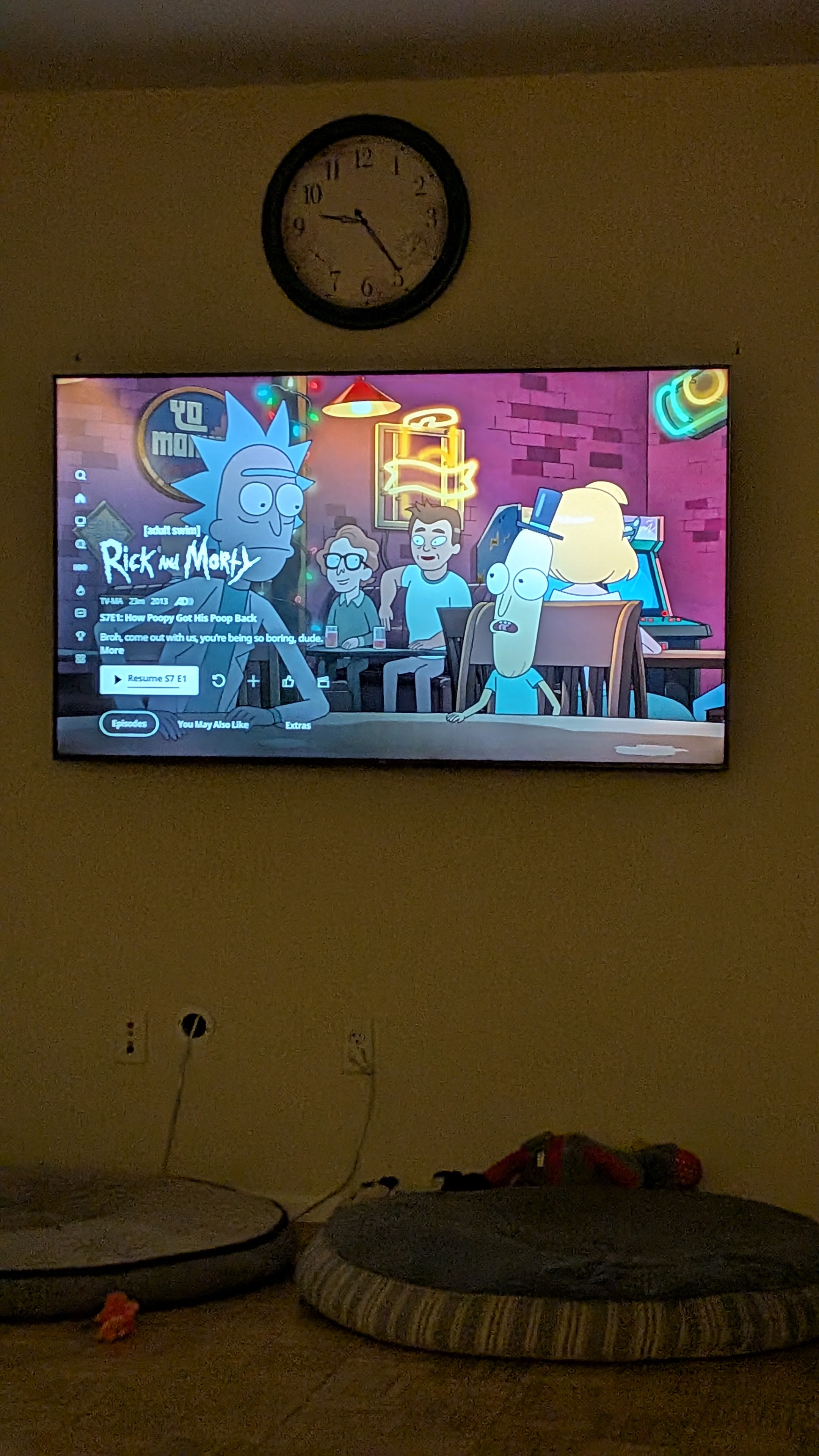 "description": "The image shows a living room with a TV mounted on the wall. On the TV screen is the animated show \"Rick and Morty.\" The episode displayed is \"How Poopy Got His Poop Back,\" which is the first episode of season 7. Below the TV, there are two dog beds on the floor. Above the TV, a round, dark-rimmed clock is hanging on the wall. The lighting in the room is dim, suggesting it may be nighttime.",